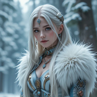 In this image, there is a female character portrayed as an elf. She has long white hair and is wearing winter attire suitable for a snowy environment. The background features a wintry landscape with trees covered in snow. The character is sitting on the ground, holding what appears to be a staff or wand. Her outfit consists of layered clothing that includes fur trim and armor elements.