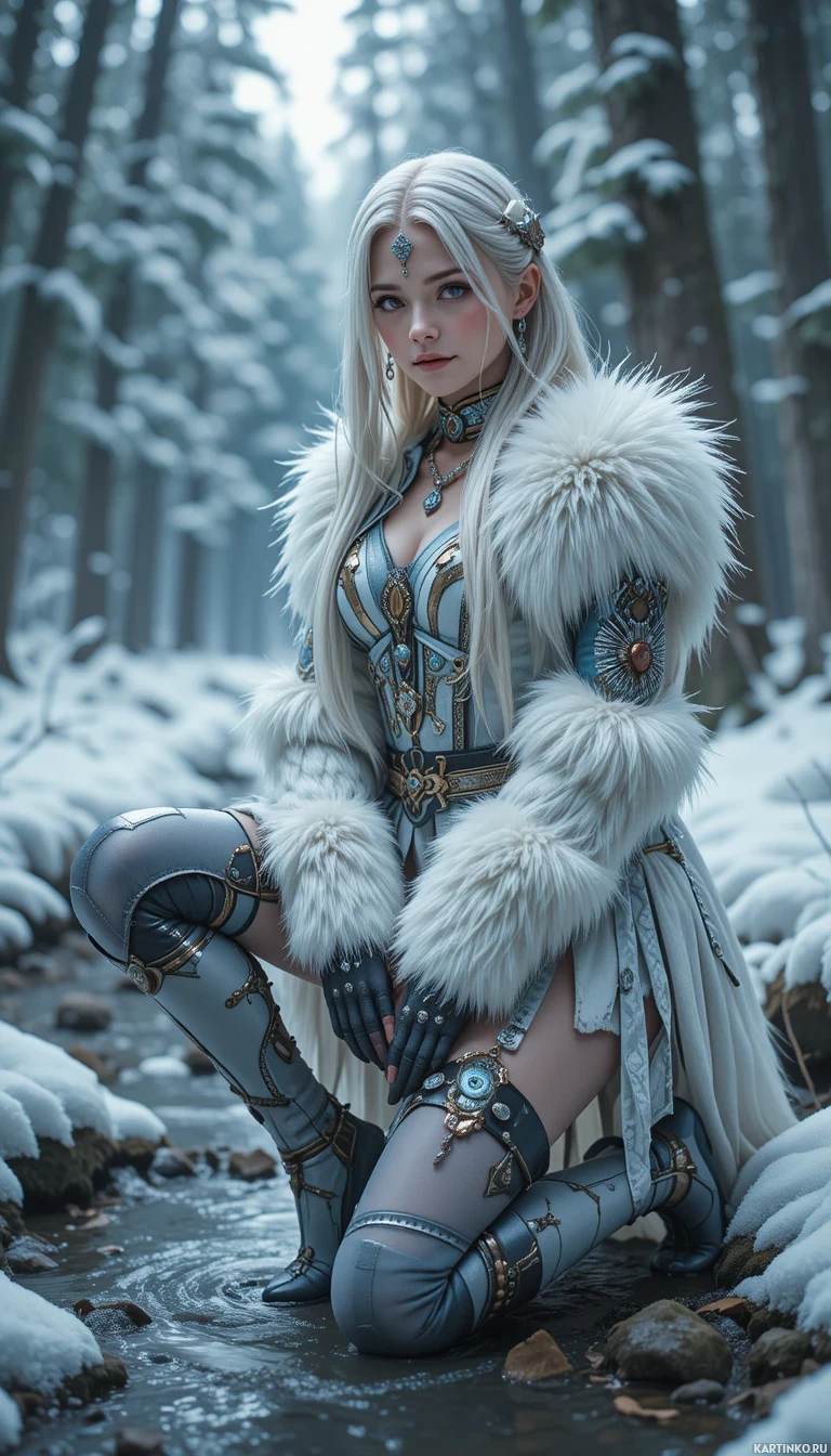 На картинке изображена эльфийская девушка с длинными белыми волосами в зимней одежде, подходящей для заснеженной местности. На заднем плане — зимний пейзаж с заснеженными деревьями. Героиня сидит на земле, держа в руках, похоже, посох или палочку. Её наряд состоит из многослойной одежды с меховой отделкой и элементами брони.