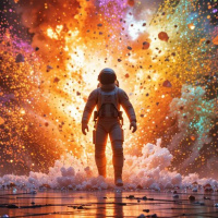 space suit and helmet, appears to be the focal point amidst the bursting energy of the scene. Surrounding the astronaut are various particles in