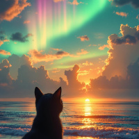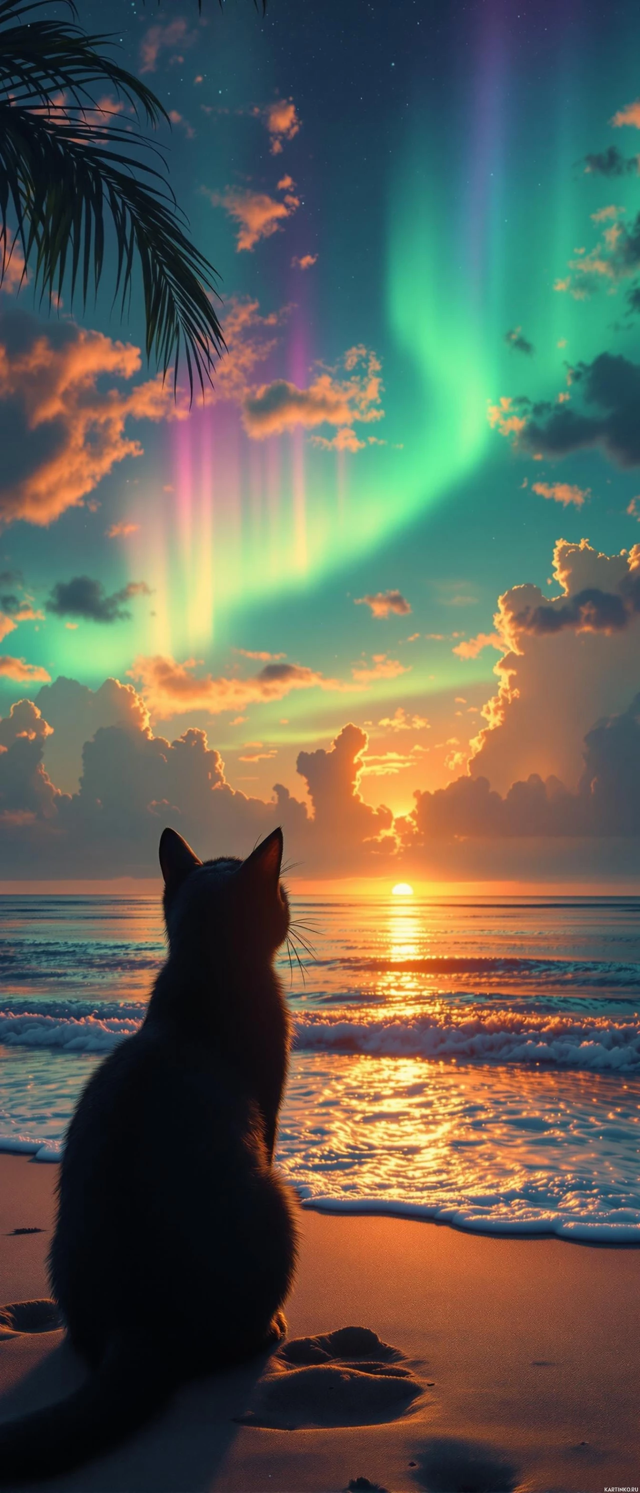 Картинка запечатлела безмятежную пляжную сцену на закате. На песке сидит чёрный кот, смотрящий на океан, над которым в небе разливаются тёплые оранжевые и жёлтые оттенки заходящего солнца. Над горизонтом видны яркие зелёные огни полярного сияния, дополняющие эту живописную картину. Безмятежность пейзажа создаёт ощущение спокойного завершения дня.