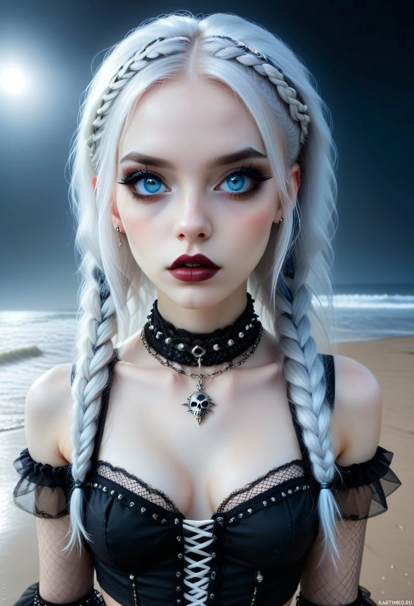a beach scene featuring sand and possibly water, contributing to a moody atmosphere. The lighting focuses on the person's face, giving it a dramatic effect that highlights their features against the darker surroundings. The overall style of the image is reminiscent of digital art or character design from video games or graphic novels, where realistic features are often combined with fantastical elements to create an alternative and striking appearance.