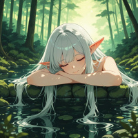white hair, who appears to be resting. The elf has closed eyes and is lying back in the water, possibly a forest stream or a clearing within a forest, surrounded by