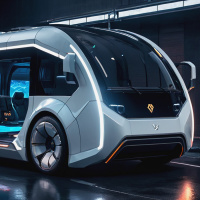 The image depicts a modern, futuristic electric bus with