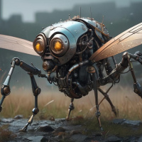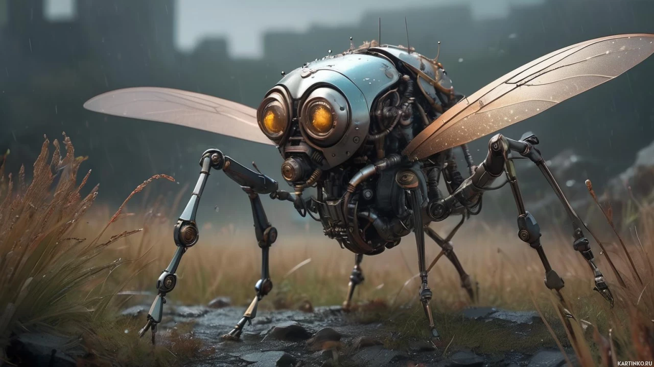 science fiction with the natural world. At the center of the image, there is an insect-like robot with mechanical parts and glowing