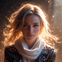 leather jacket over what seems to be a white turtleneck sweater. The lighting on her skin gives it an almost