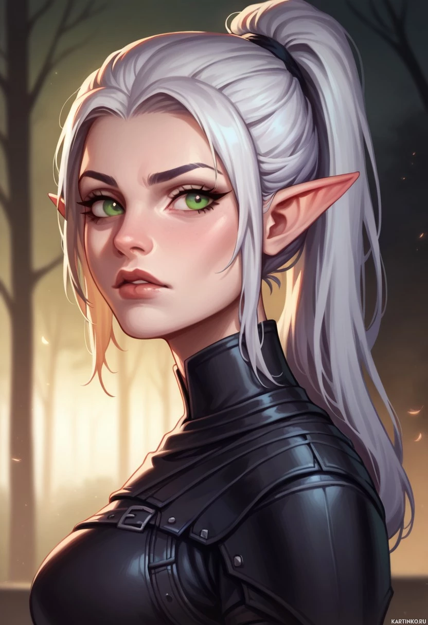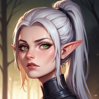white hair and pointed ears, which are typical characteristics of fantasy elves in various media. The character is wearing