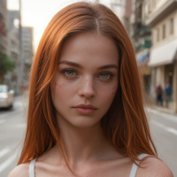 an urban setting, possibly on a sidewalk or street, as there are blurred city elements in the background which suggest she is standing outdoors. Her attire consists of a sleeveless