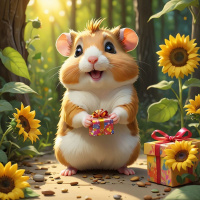 a fluffy animal resembling a humster holding a wrapped present with both paws. The animal has