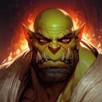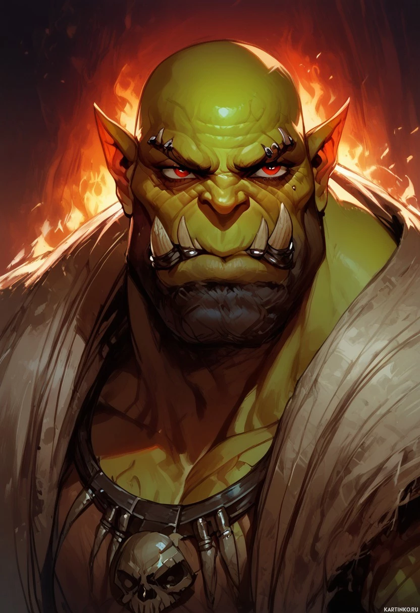 green skin with prominent muscles and bones. His facial expression conveys aggression, with glowing