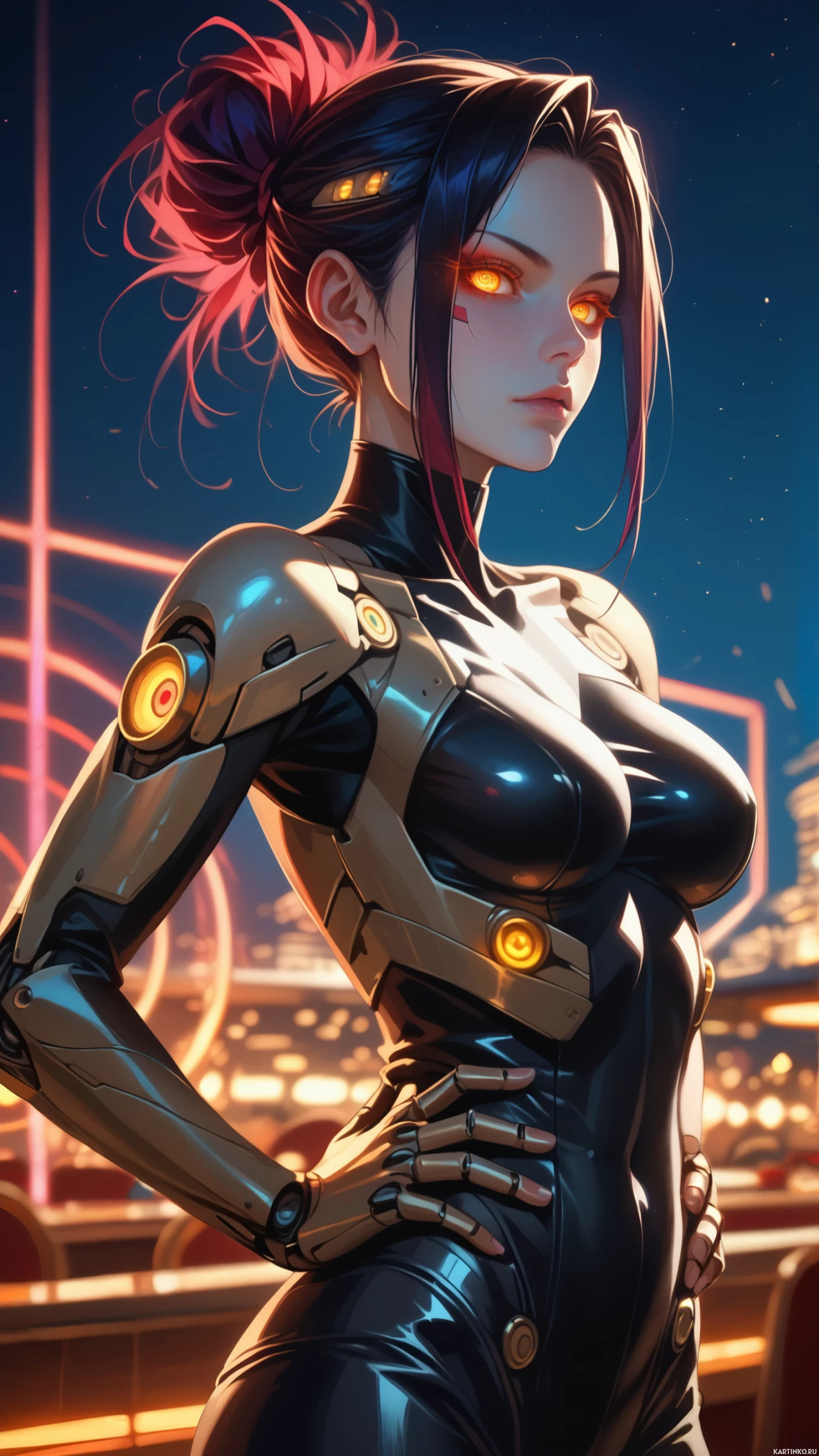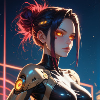 glowing eyes that emit red light and what appears to be a powered-on state indicated by the illuminated panels on her chest and shoulders. Her hair is styled in a bob cut with a side parting, and she has