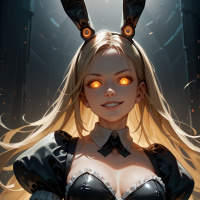 blonde hair and striking red eyes. Her expression is one of contentment or