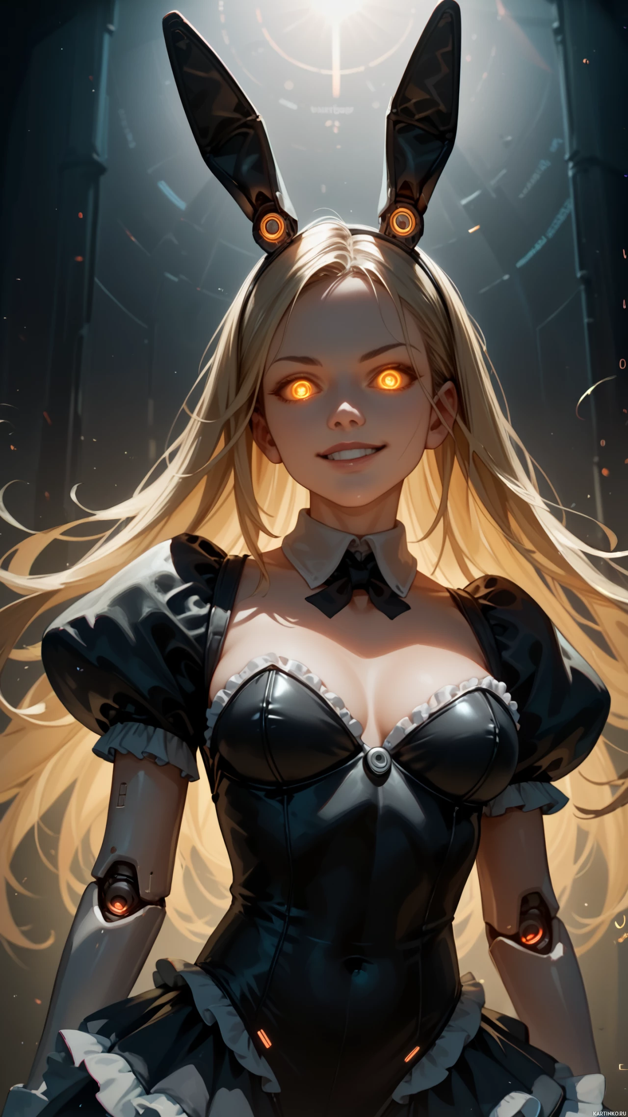 science fiction themes, with a touch of steampunk design, as indicated by the mechanical parts visible in her outfit and around her. The lighting in the image is soft, creating a warm glow around her face.