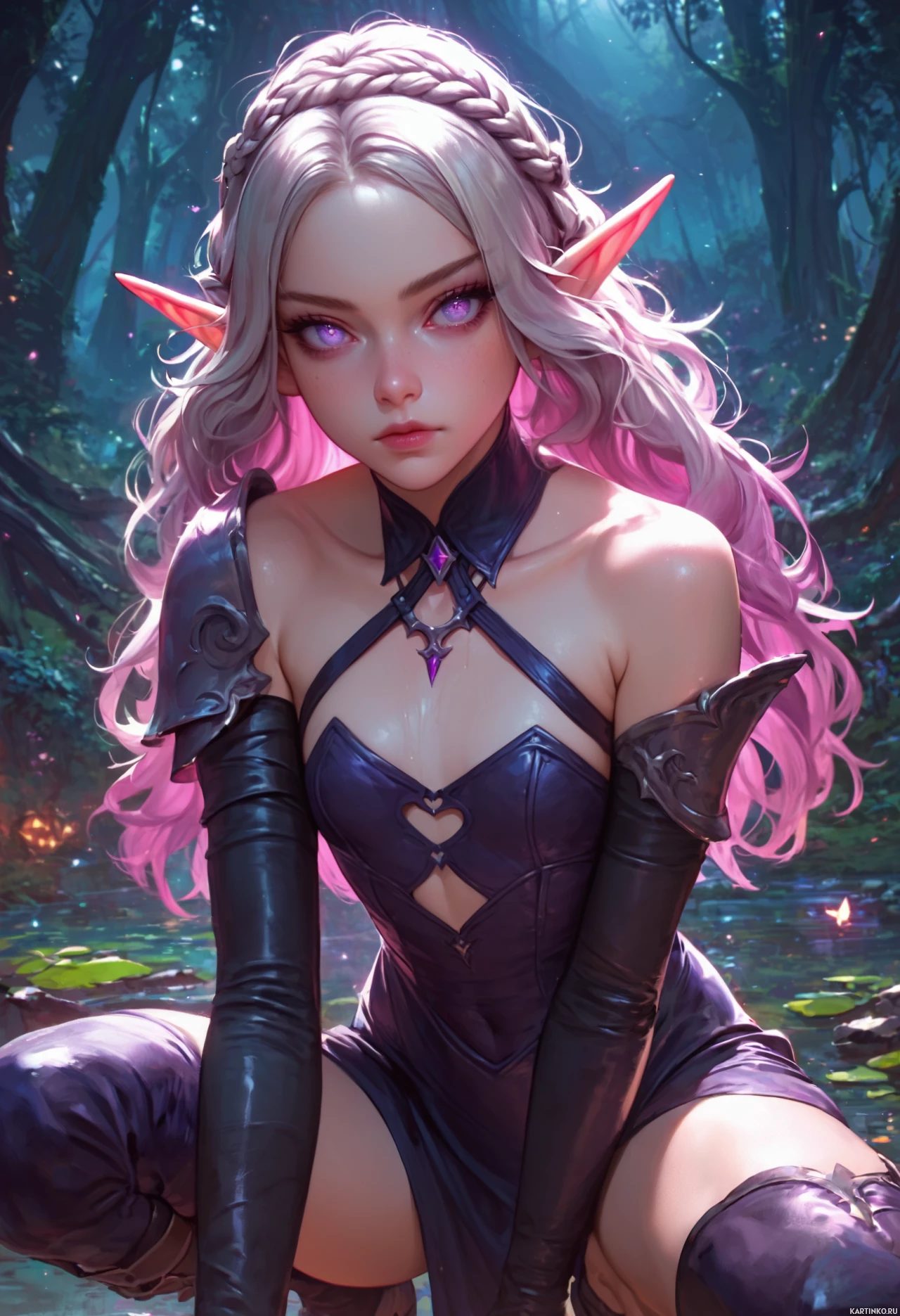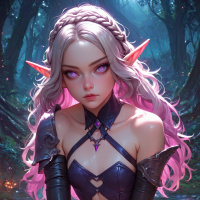 a female character with pink hair styled in an elfin manner, suggesting she is portraying an elf. She has striking