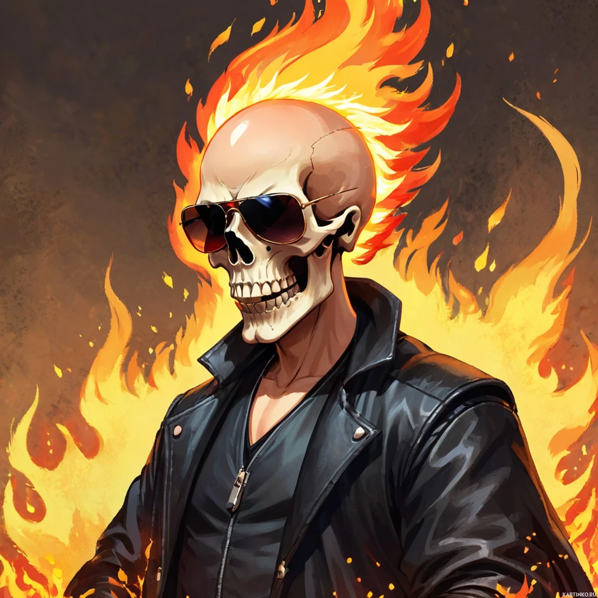 The image features an illustration of a character that appears to be inspired by the comic book character Ghost Rider. This character has flames coming out of his skull, which is typically associated with the Ghost Rider persona in
