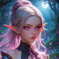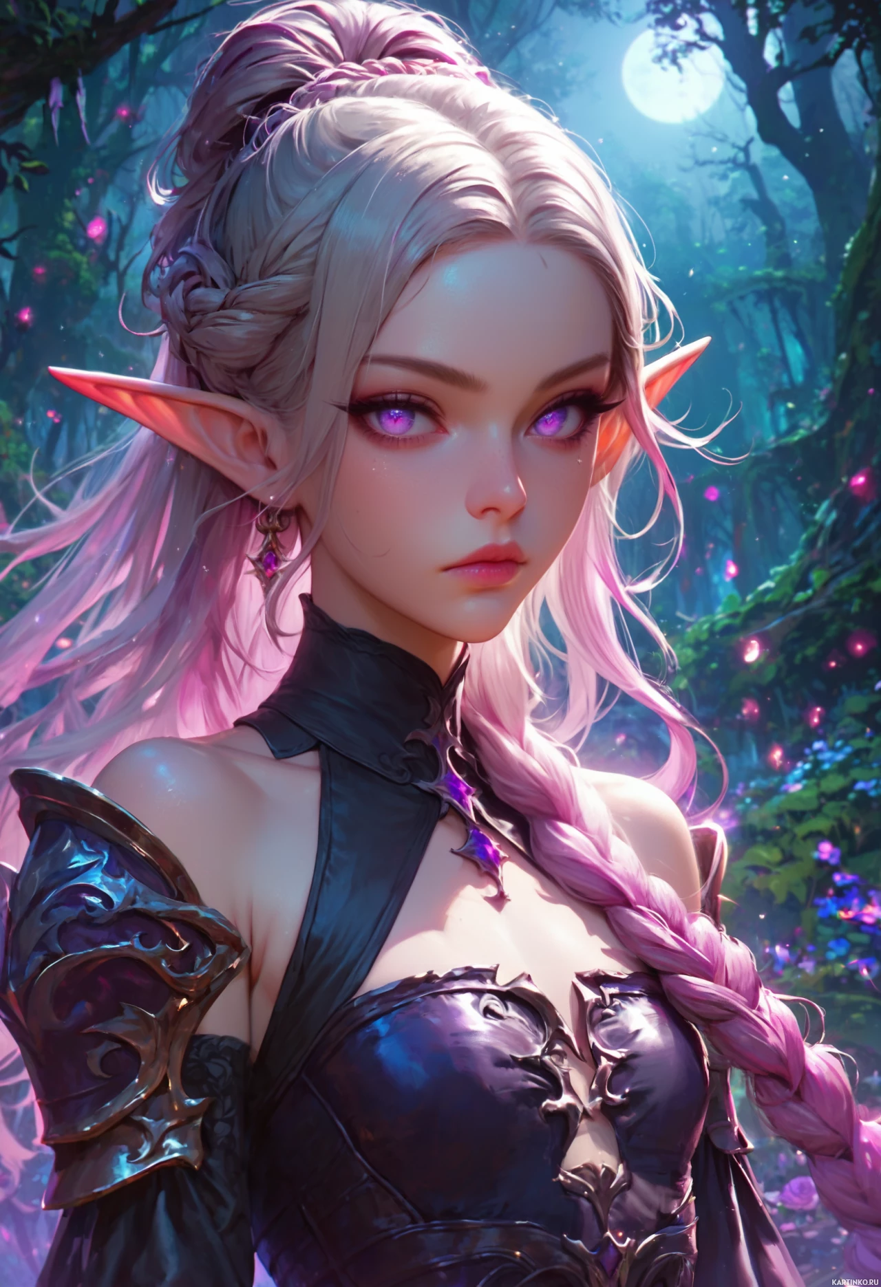 The image portrays a fantasy-themed character, likely an elf given the pointed ears and the common features associated with that archetype in