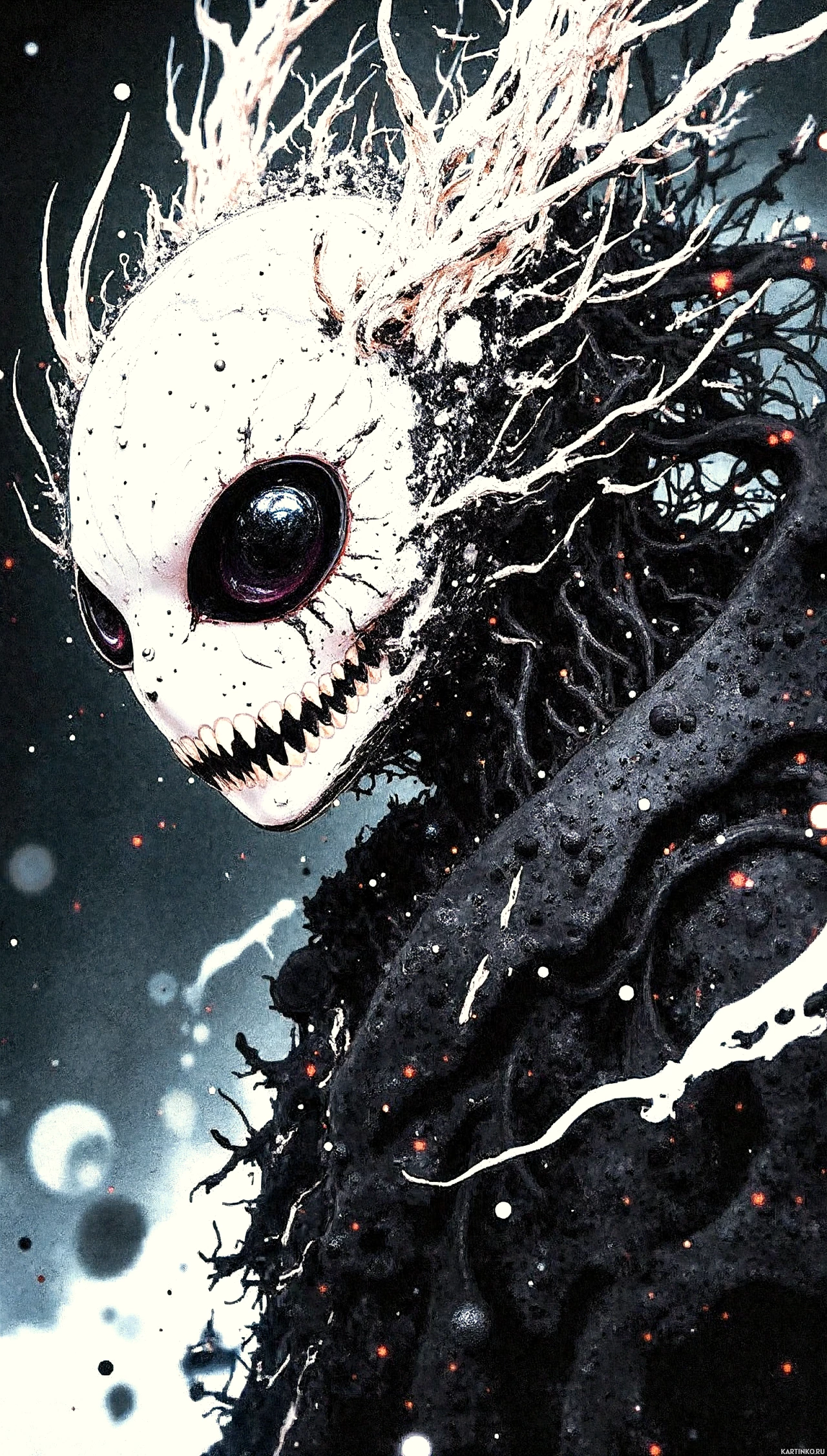 tree branches or roots protruding from the top of its skull, suggesting some form of vegetation or nature elements being part of the creature's design. The background is dark and blurred, which puts a spotlight on the monster itself. There is also a suggestion of blood or decay around the character's face.