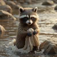 На картинке енот сидит на камне в воде. Кажется, он держит что-то в лапах – возможно, еду или найденную вещь. Место выглядит спокойным и естественным: вокруг камни и по краям воды – либо трава, либо камыш.