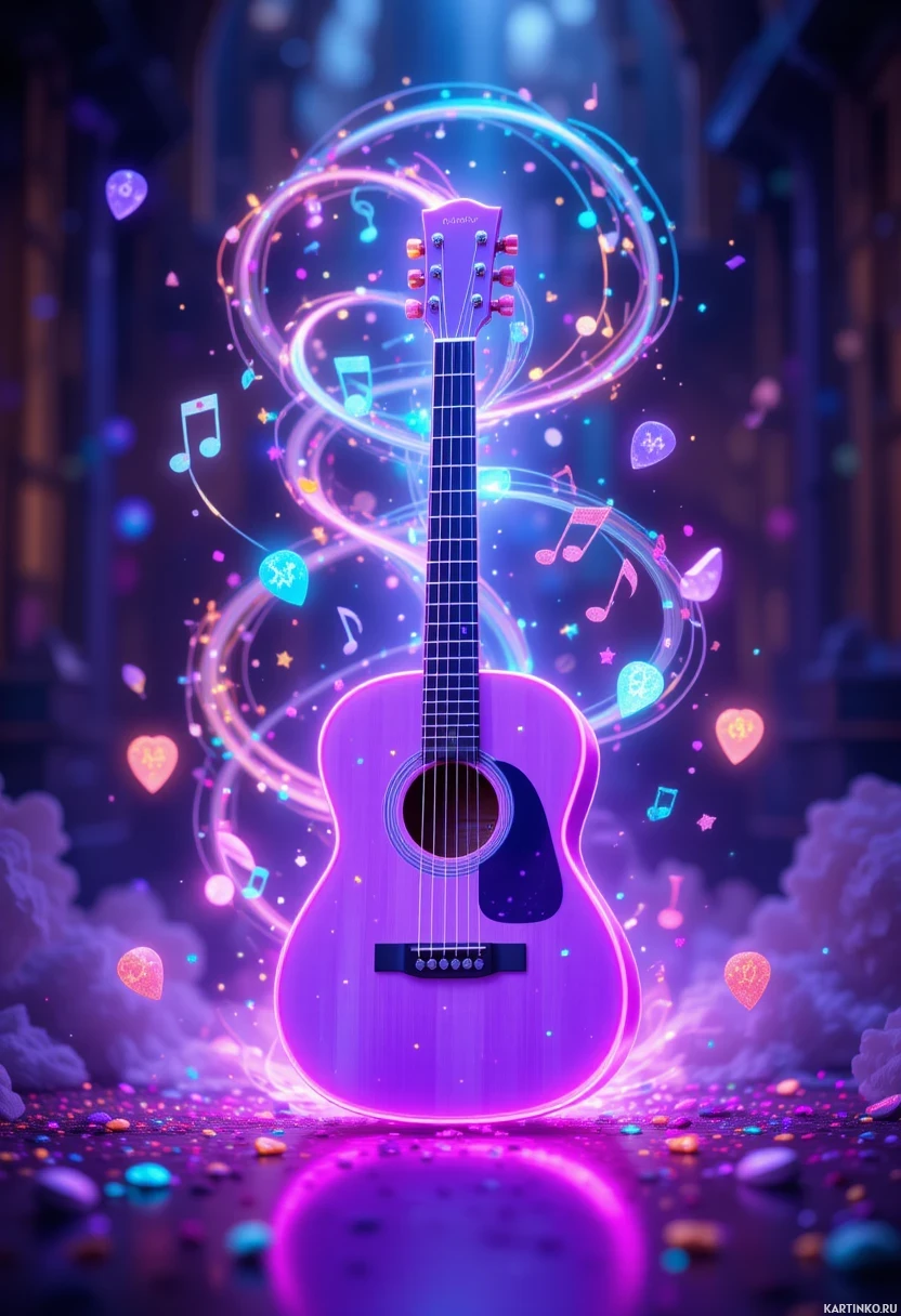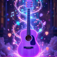 acoustic guitar as the central focus. Surrounding the guitar are various