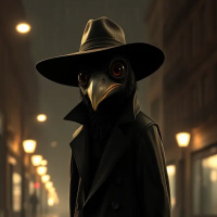 a top hat and a long trench coat, suggesting it might be raining or about to rain. Its eyes are covered with bandages, giving it a somewhat ominous appearance. There's also a small detail that appears to be a hand holding a gun in its mouth, adding to