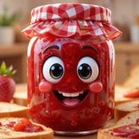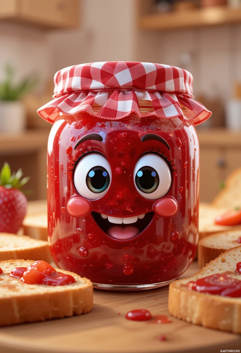 a smiley face drawn on it. It's sitting on top of wooden cutting boards or platters, which are adorned with slices of toast that have jam spread across them. There is also a strawberry in the background, suggesting that the jam might be strawberry-flavored. The overall tone of the image is cheerful and playful, appealing to the idea of enjoying a tasty snack.