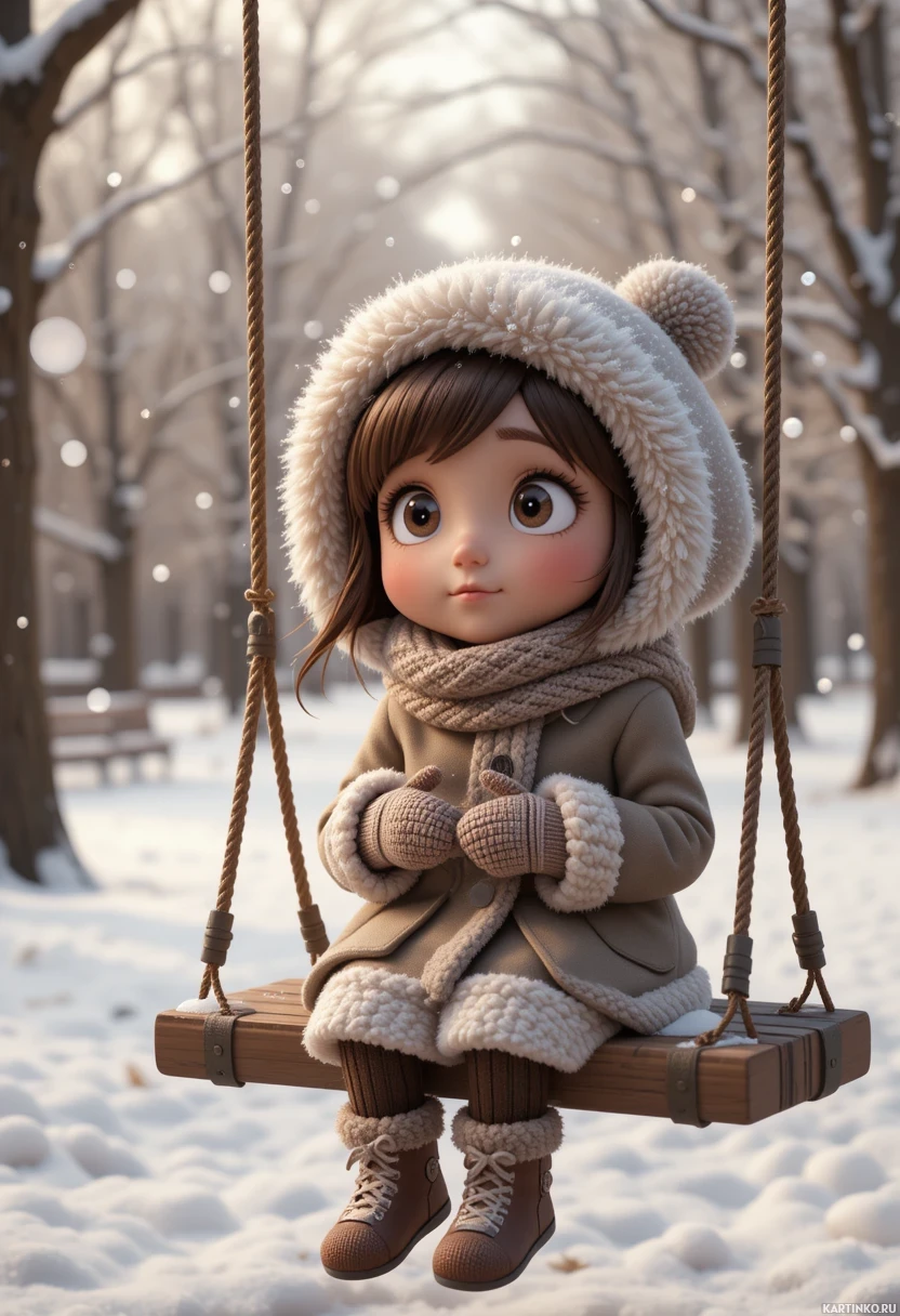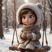 a young girl sitting on a wooden swing in what appears to be a snowy park during winter. She is wearing a tan coat with