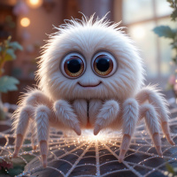 a small creature that appears to be a fusion of a spider and a sheep. It has the body of a spider with long legs and a segmented abdomen, but instead of the usual spider head, it has a cute little face resembling a sheep's, complete with large