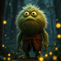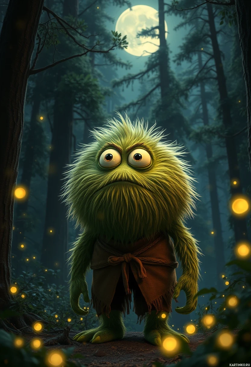 an animated character, a large green creature with spiky hair, standing in a forest at night. The monster appears to be startled or frightened, as evidenced by its