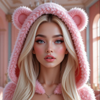 a young woman with blonde hair wearing a hooded jacket. She is posing for the photo, and her makeup includes prominent eyelashes and