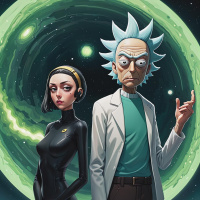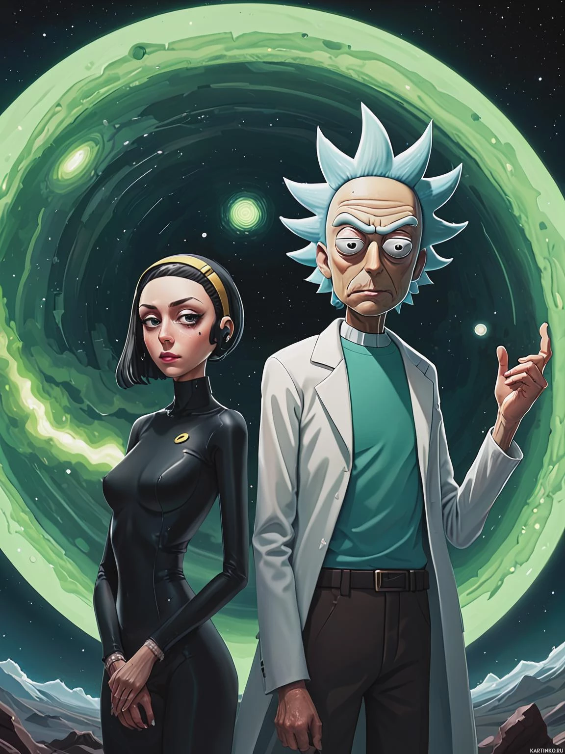 a female character named Meeseeks, set against an intricate backdrop that suggests a futuristic or otherworldly setting. Rick is on the right side of the frame, wearing his signature white