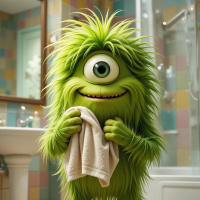 a bathroom sink visible, suggesting that this scene takes place in a bathroom. The character's expression is neutral to slightly concerned, and its posture appears relaxed but alert.