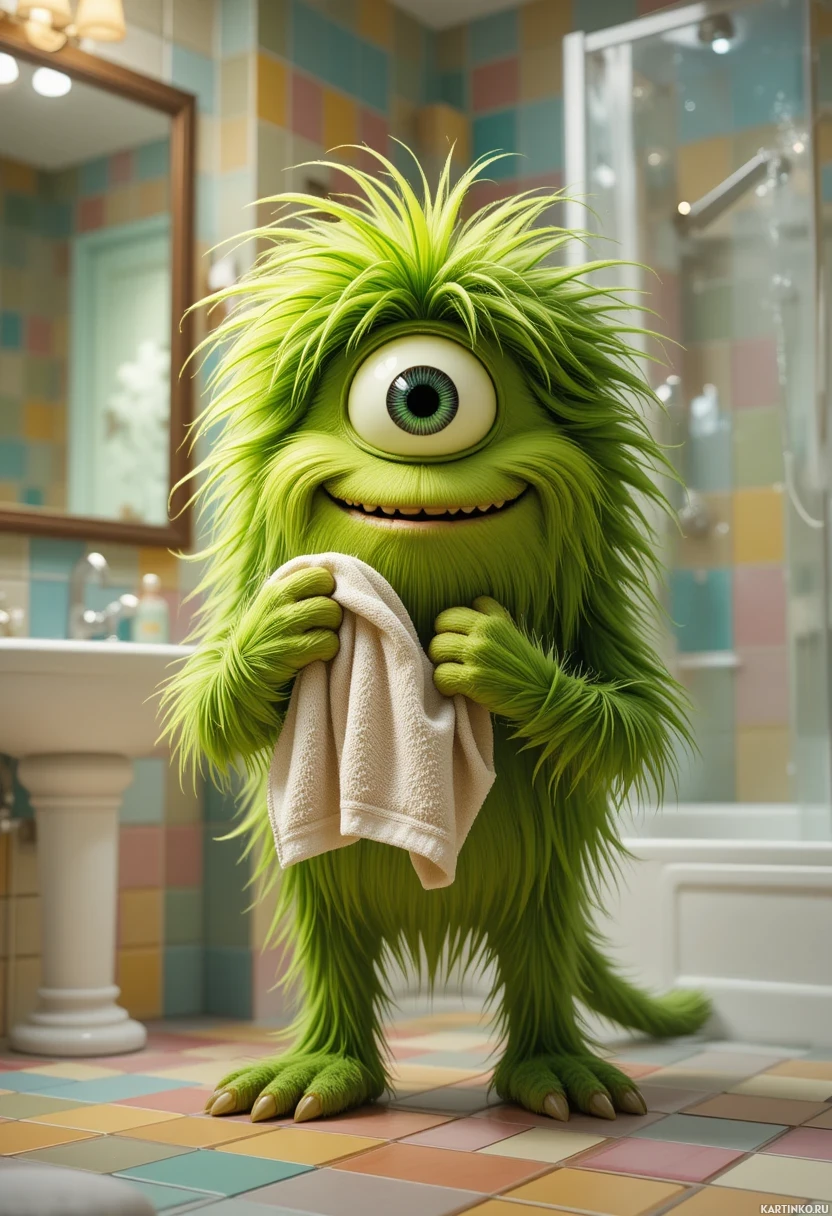 expressive eyes and fur in shades of green. The character has one hand holding up what seems to be a small