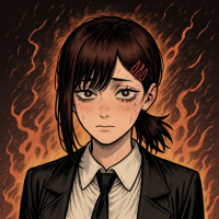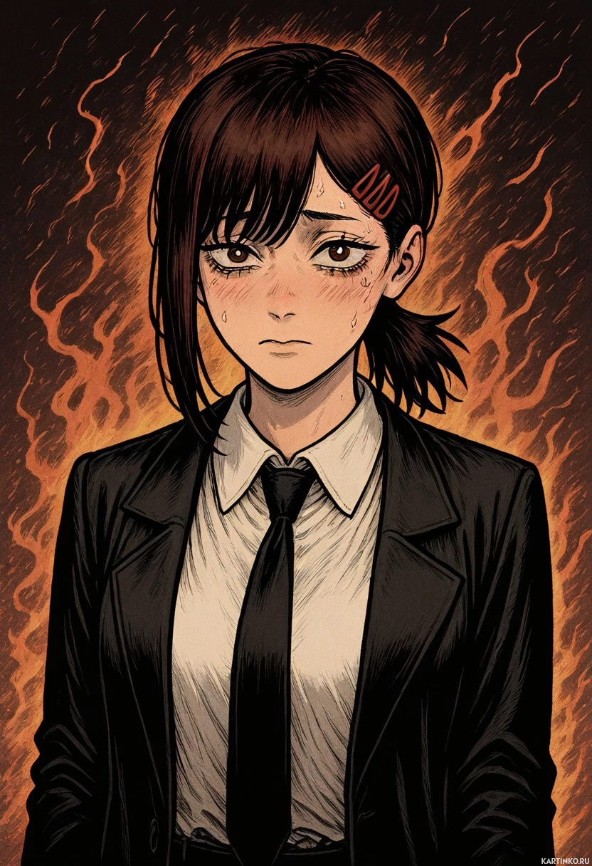 a formal suit and tie, which suggests she might be a professional or someone in a position of authority. The background of the illustration shows flames, possibly indicating a fire or danger nearby, which contributes to the tension and intensity of the character's expression.