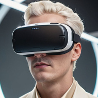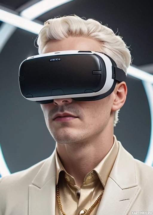 white hair. He is wearing what appears to be a virtual reality (VR) headset on his head and looking directly at the camera with