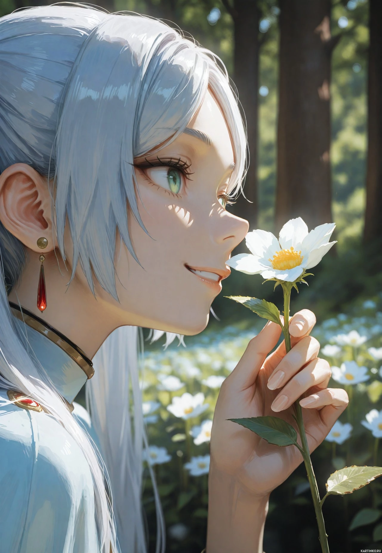 white hair, smiling gently. She is holding a flower to her nose and appears to be enjoying the fragrance. The character has a somewhat ethereal look, with large