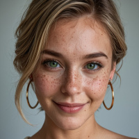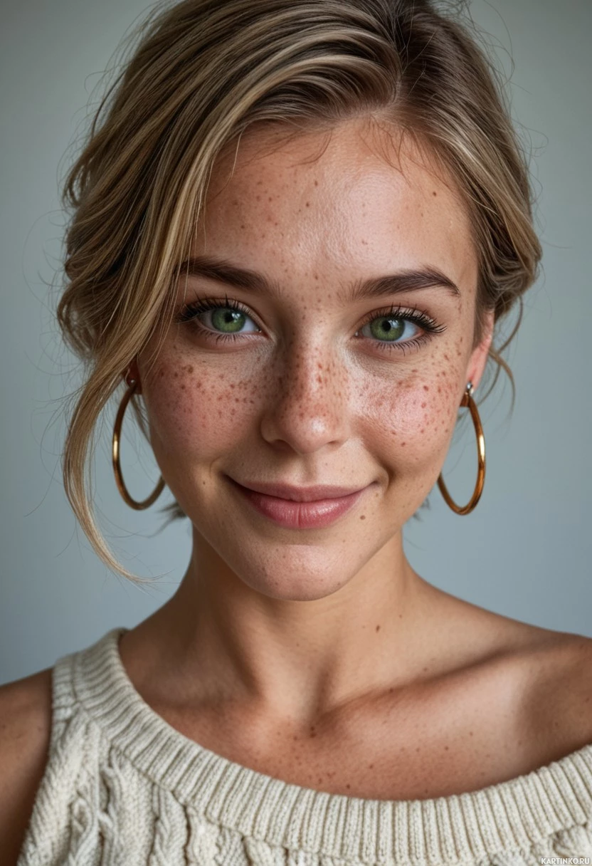 blonde hair. She has freckles across her face and is wearing makeup that includes what appears to be eyeliner, lipstick, and mascara. Her eyes are green. She is dressed in a crocheted sweater or knit top. The background is neutral-toned, providing