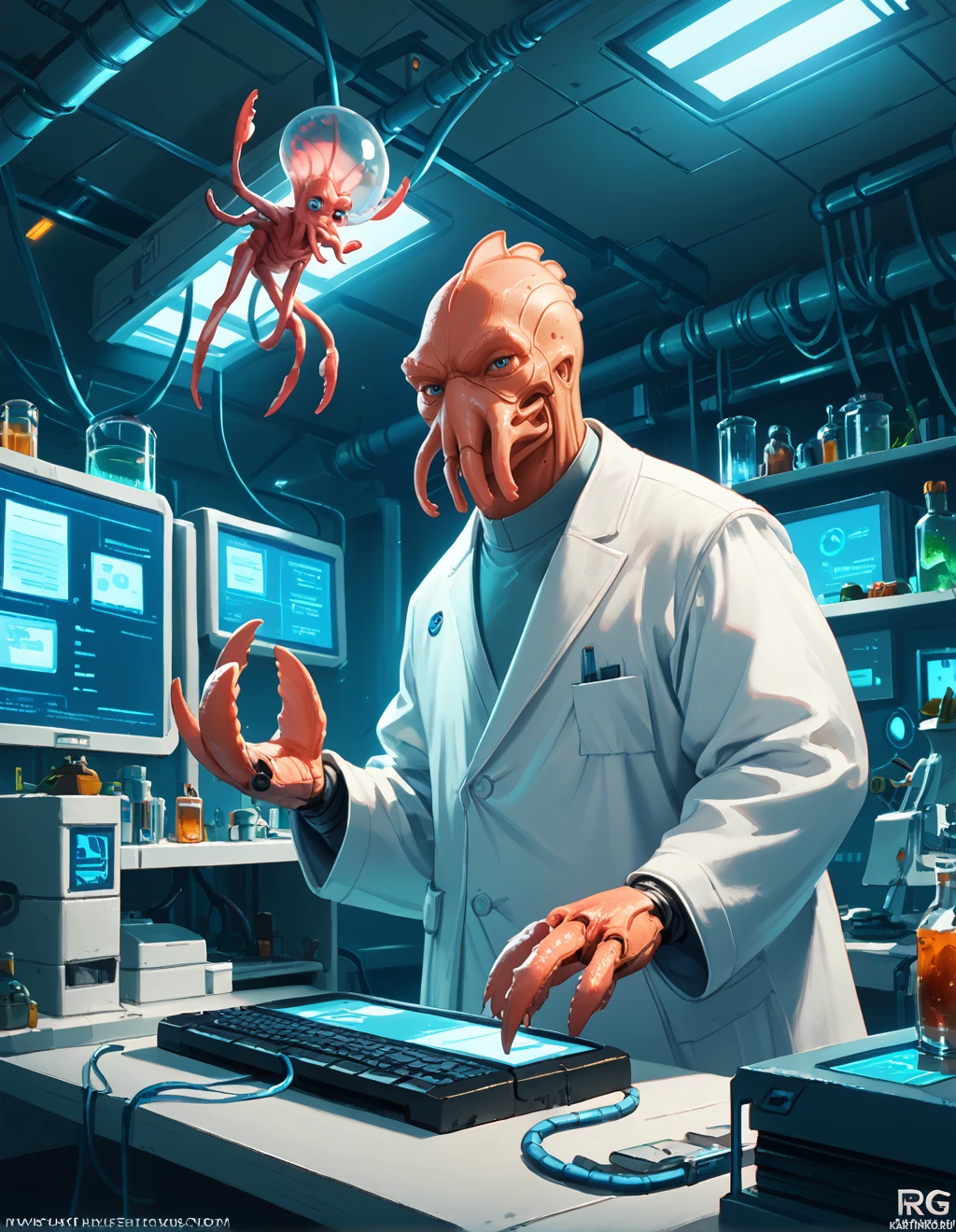 a laboratory setting, surrounded by various pieces of equipment such as microscopes and beakers on shelves in the background. The character appears to be engaged in some sort of scientific work or experimentation, with one hand gesturing towards what seems to be an incubator housing another