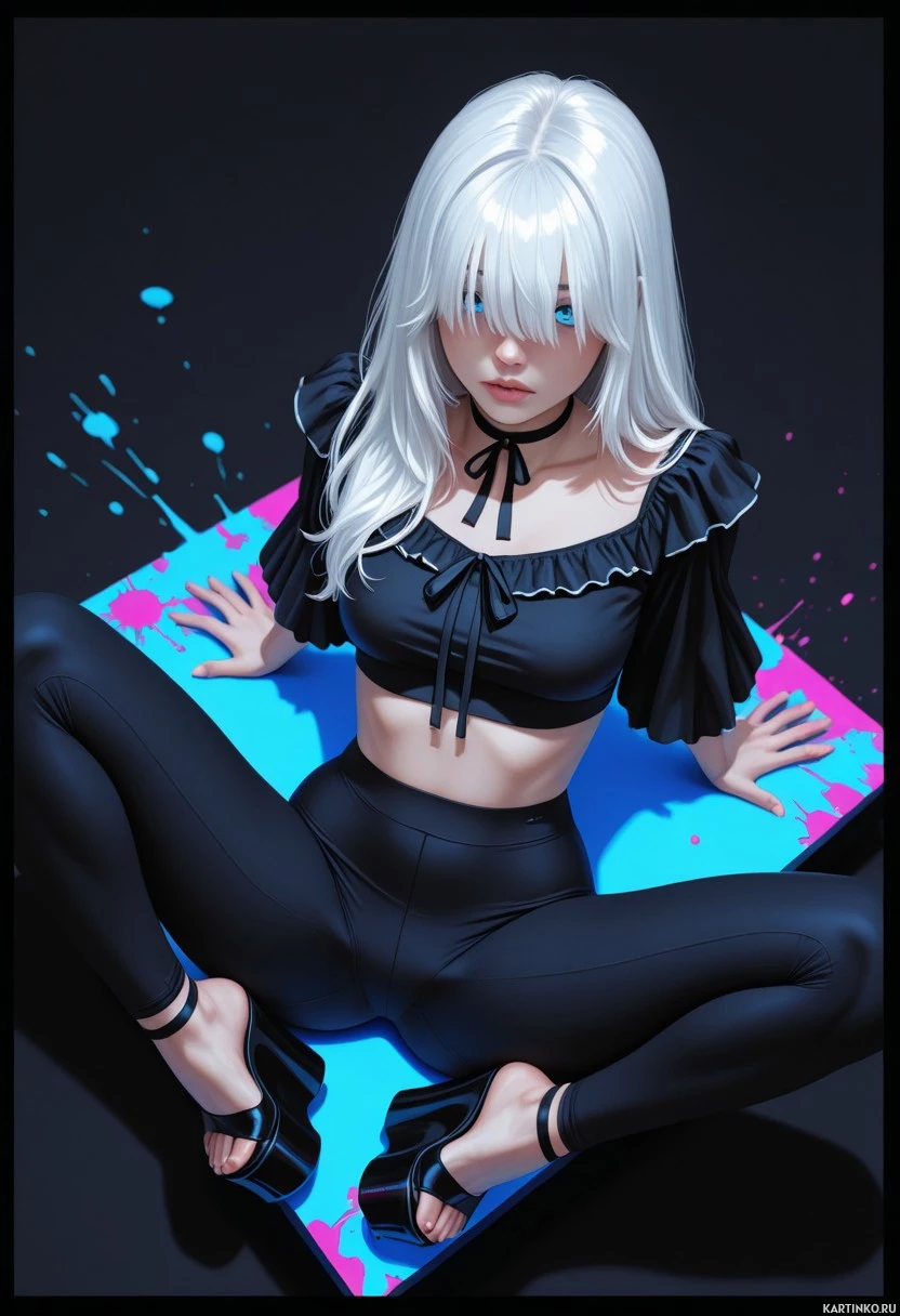 digital art and illustration styles. The woman appears to be sitting on her hands and knees on what seems like a blue geometric platform, possibly referencing