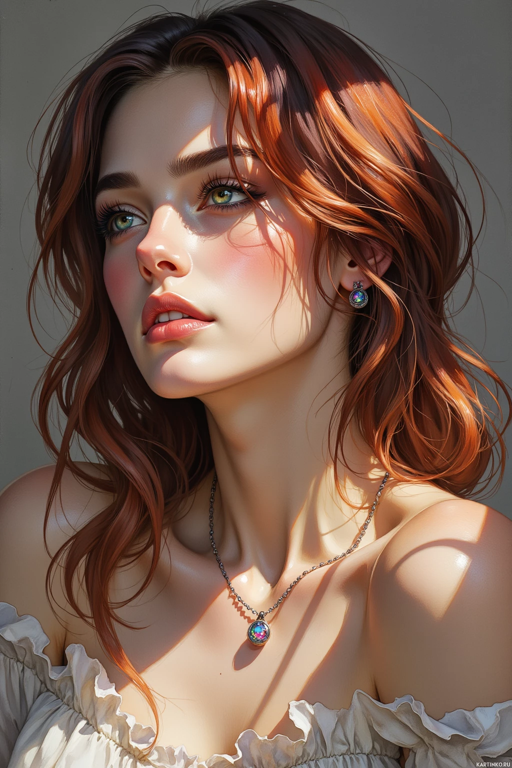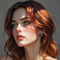 a young woman with fair skin and striking red hair styled in loose waves that fall just past her shoulders. She has