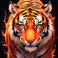 a dramatic effect that suggests heat or fire might be involved in this depiction. The background is dark, which helps the tiger stand out prominently as the central figure of the image. The style of the artwork is realistic with some fantastical elements added for