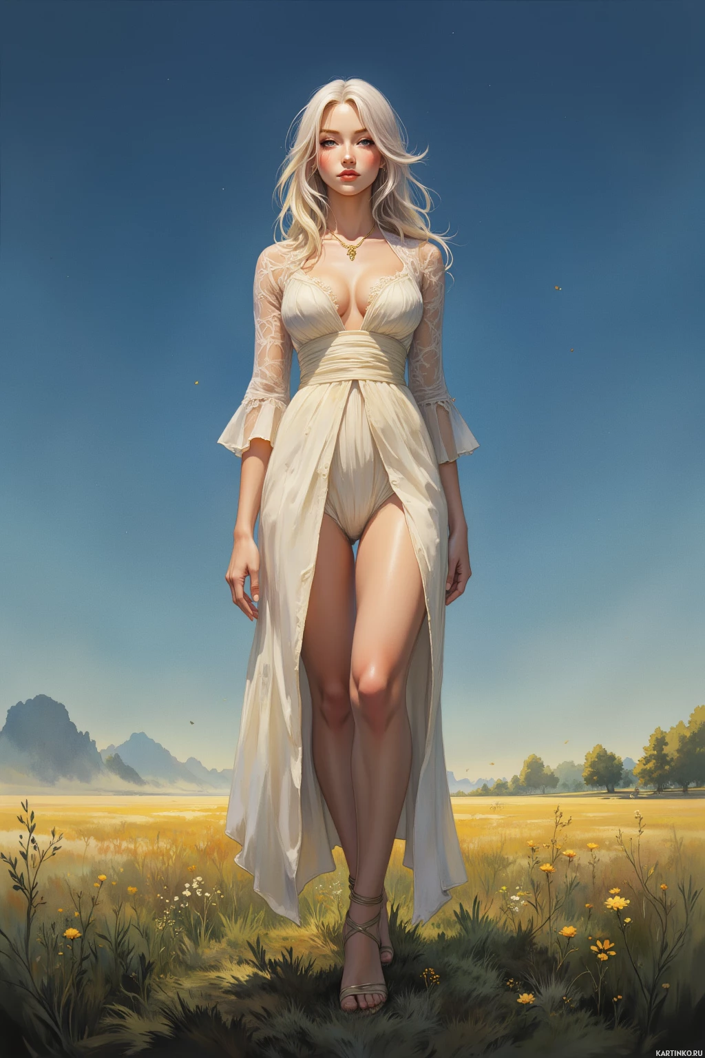 blonde hair and her attire consists of a sheer, white dress with off-the-shoulder sleeves that drape elegantly over the ground. The character is looking directly at the viewer with