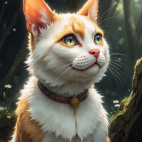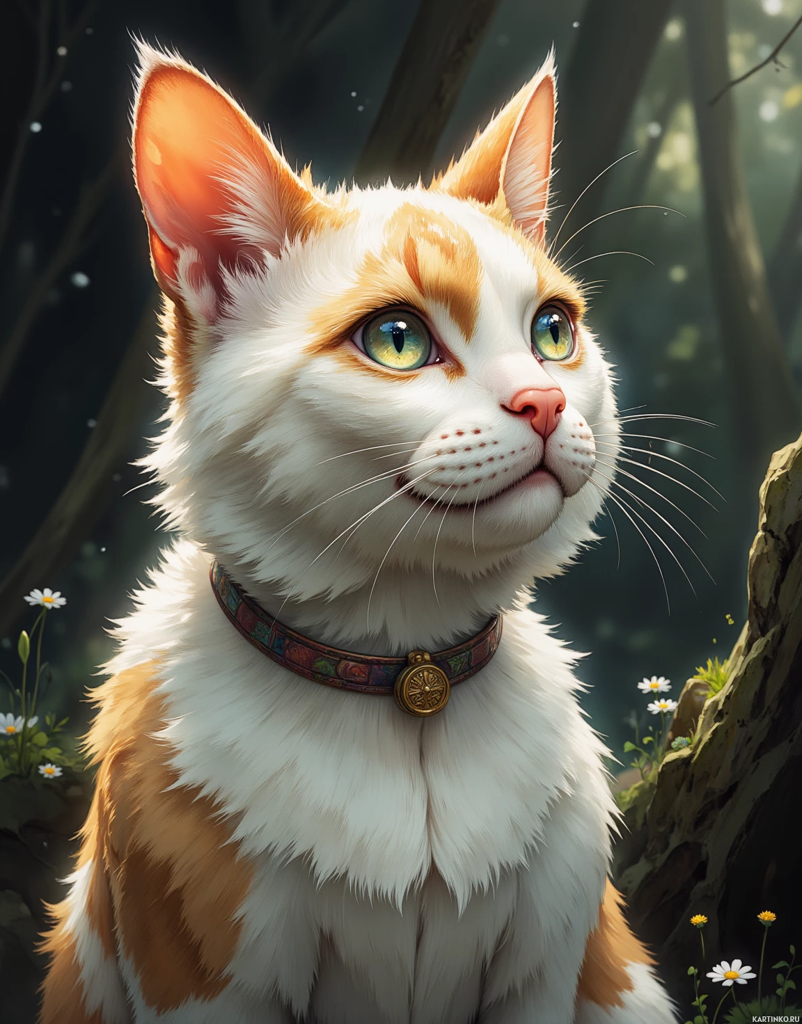 a forest floor. The cat's fur is rendered with soft strokes that give it