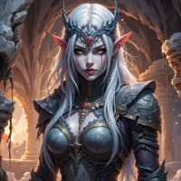 white hair that falls over her shoulders, and pointed ears, which are common characteristics for elves in fantasy genres. Her eyes have