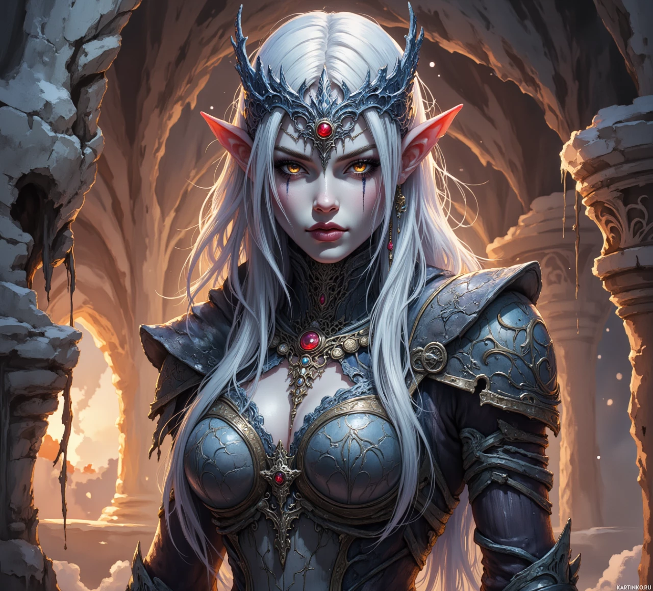a female character with elven features, depicted in a three-quarter view. She has long