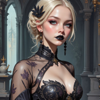 blue eyes, dark lips, and her hair is styled into an updo. The character is adorned with intricate details such as black lace adornments,