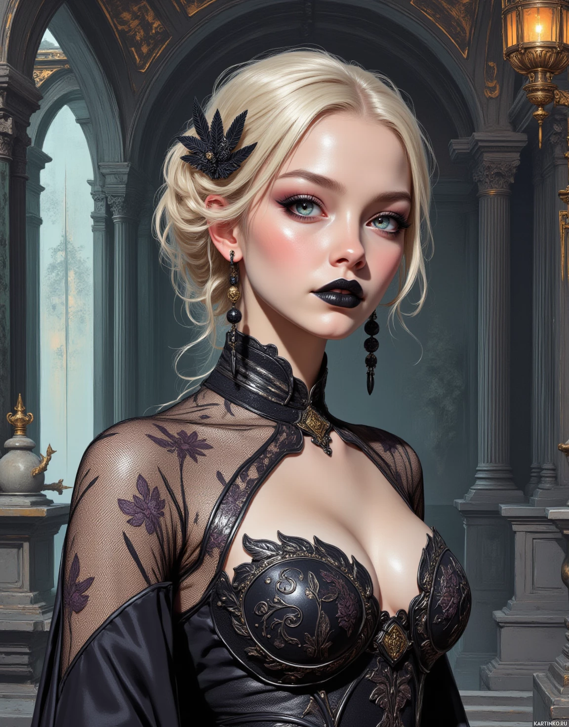 a female character who appears to be a blonde with pale skin, wearing a highly stylized outfit that resembles Gothic or fantasy fashion. Her expression is neutral and her gaze is directed towards the viewer. She has striking