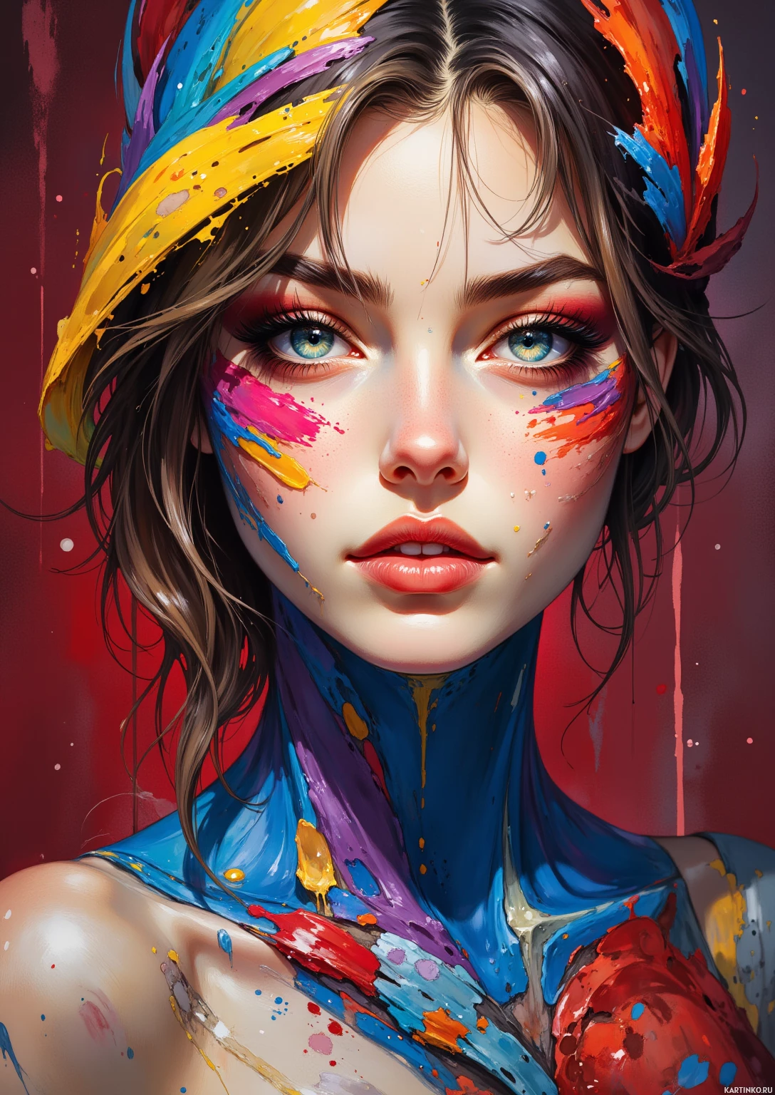 red color. The overall impression is one of an artist immersed in her work, perhaps portraying the creative process or the transformative power of art. The style suggests a fusion of realism and abstract art, with attention to detail evident in the play of light and shadow across the woman's face and the interplay of colors on her skin.