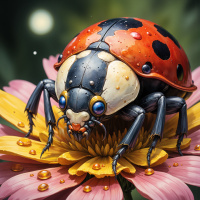 drops of water on the ladybug's surface, adding to the lifelike appearance of the illustration. The overall style of the image combines elements of realism with imaginative storytelling, creating a whimsical and