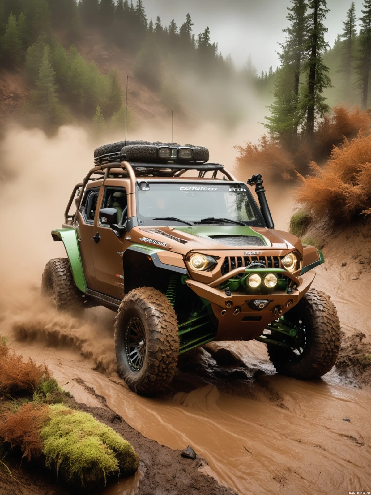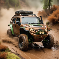 rugged terrains. There are visible trails of dust or mud being kicked up by the wheels. In the background, there appears to be