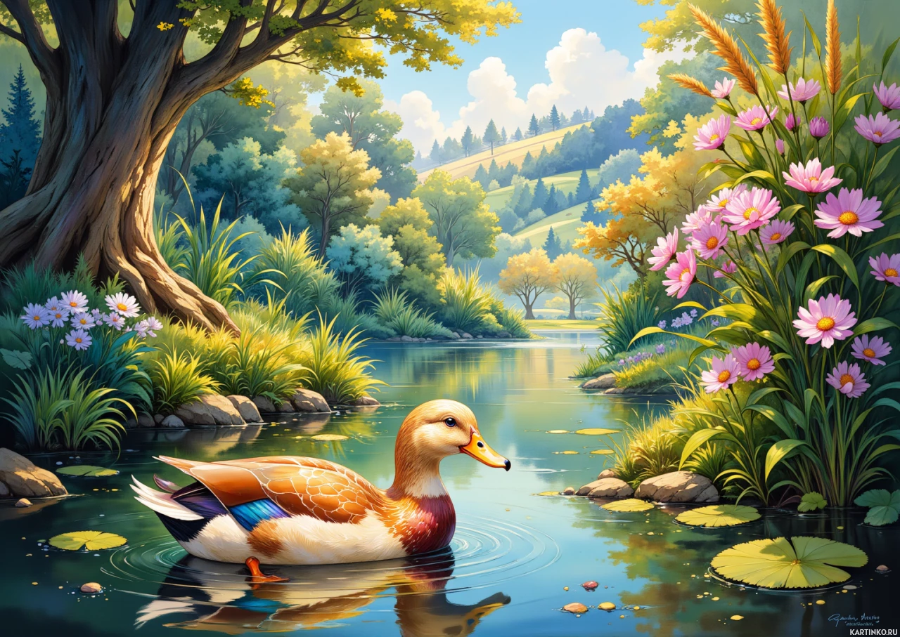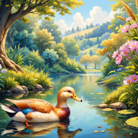 nature scene. At the center of the composition, there's a duck swimming in