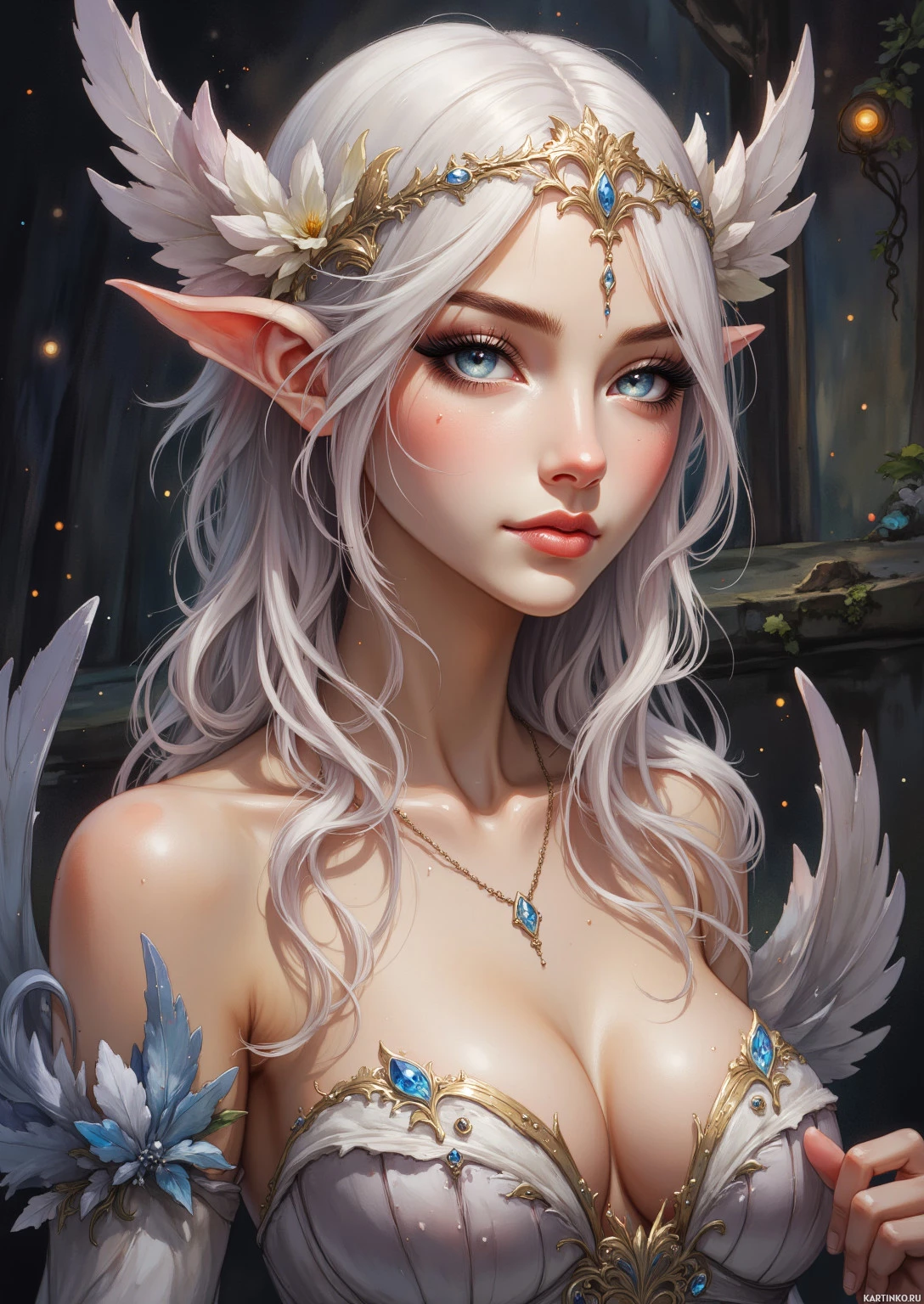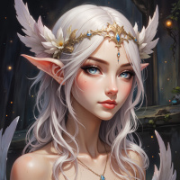pointed ears, and her hair is long and appears to be wavy or curled. The character is wearing